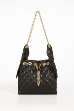 Produzida em material premium com textura macia e costuras precisas, a bolsa apresenta alça de corrente dourada e fechamento com cordão metálico, que unem charme e praticidade.