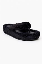 O modelo possui tiras largas que abraçam o pé com segurança, enquanto o revestimento em pelo garante um toque de sofisticação e tendência — perfeito para produções comfy chic que estão super em alta.