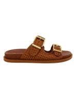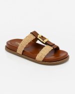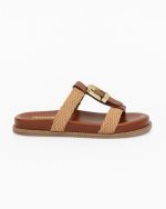 Com design artesanal e acabamento impecável, ela apresenta tramas em material tramado com duas fivelas douradas robustas, que adicionam um toque sofisticado e atual ao look.