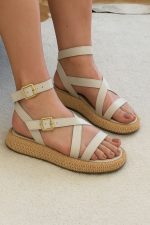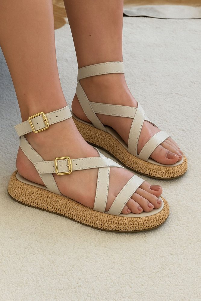 Aposte no charme rústico e sofisticado da sandália feminina rasteira flatform em palha natural.